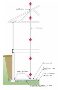 You cannot test for radon until after the home is built. Fortunately, exposure to radon can be eliminated through an inexpensive radon mitigation system installed during construction. This system basically consists of a perforated pipe underneath the basement foundation floor, that connects to a vertical vent pipe ran up through a chase, on through the attic, and vented out of the house through the roof.